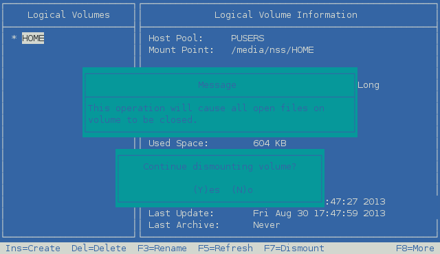On the NSSMU Volumes page, select the volume, then press F7 Dismount.