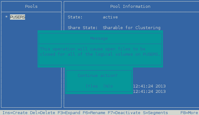 Read the warning message that the pool’s volumes will be dismounted, then press y (Yes) to confirm the deactivation.