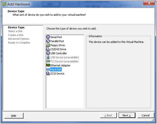 1. On the Hardware tab, click Add, select Hard Disk as the Device Type, then click Next.