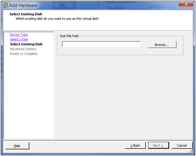 2. On the Select a Disk page, select Use an existing virtual disk, then click Next.