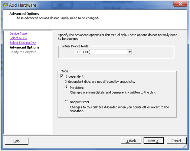 • Virtual Device Node: Select SCSI (1:0) (or the default node value offered as appropriate if you have added multiple disks) from the drop-down box.