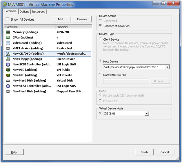 2. On the Hardware tab of the Virtual Machine Properties page, add a CD/DVD device, then set its properties.