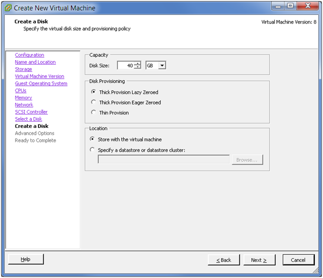 • Disk Provisioning: Select Thick Provision Lazy Zero.