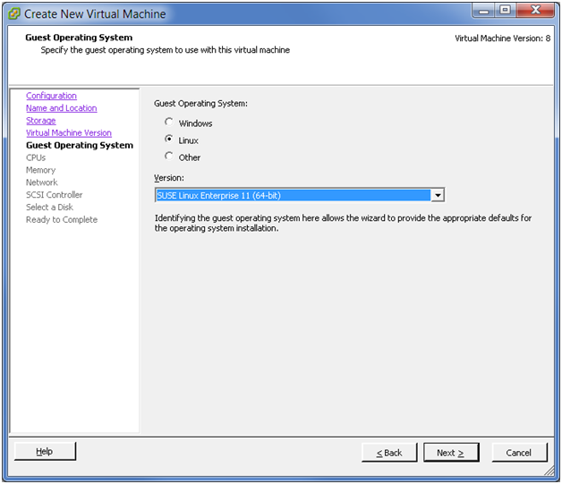 For the OES Server, select Linux as the Guest Operating System, then select SUSE Linux Enterprise Server 11 64-bit from the Version drop-down list.