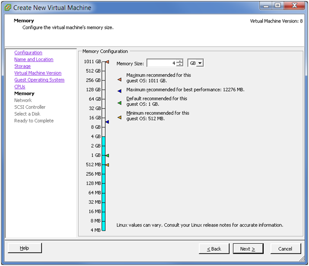 10. On the Memory page, specify the amount of memory that the guest operating system can use, then click Next.