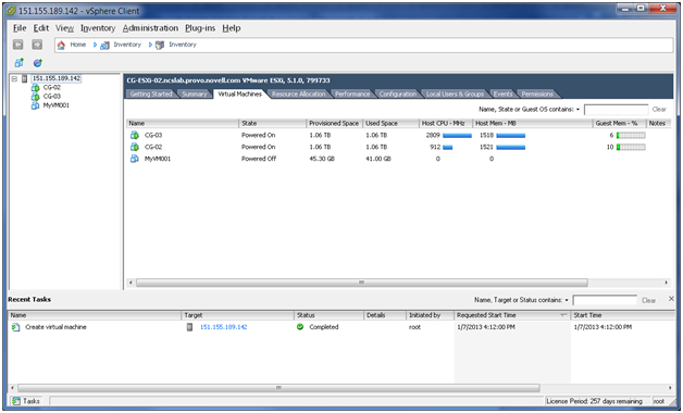 18. In the vSphere client, select Host > Virtual Machines, then verify that the newly created virtual machine appears in the VM list of the vSphere client.