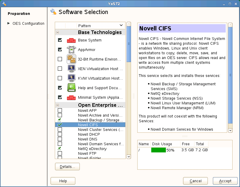 In the YaST install for OES, on the Installation Settings page, click Software to go to the Software Selections page.