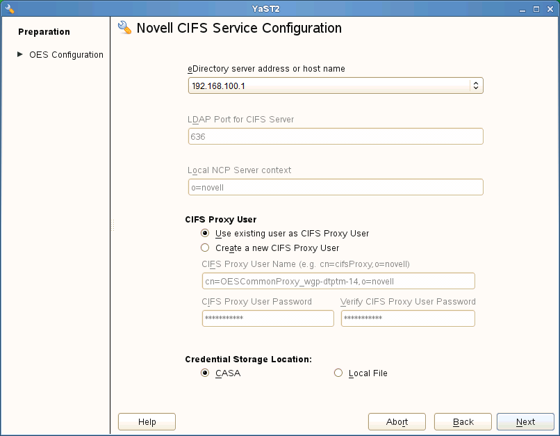 Create a new proxy user. Use the format cn=proxyusername,o=company. During eDirectory configuration, if you have selected the Use Common Proxy User as default for OES Products check box, then the proxy user and password fields are populated with common proxy user name and password. You cannot change this password in the CIFS configuration screen. |