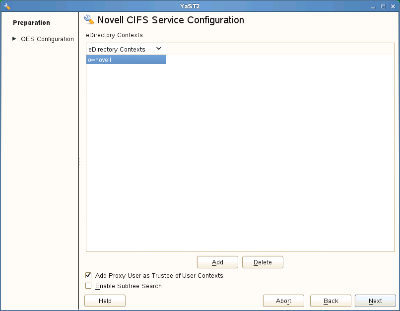 Add Proxy User as Trustee of User Contexts: This option is selected by default. Deselecting this option will not grant the CIFS proxy user the rights required over eDirectory contexts to search for a CIFS user in the subtree.