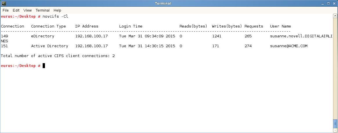 From the server console, run the novcifs -Cl command to view the connection details.