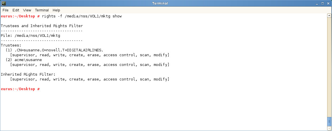 rights -f /media/nss/VOLNAME show rights -f /media/nss/VOLNAME/DIRNAME show