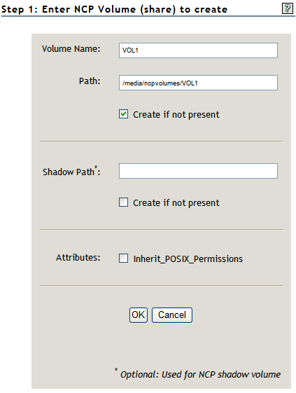 In Path, specify the path on a Linux POSIX file system (Ext3, XFS, or Reiser) to the NCP share name, then select Create If Not Present check box beneath it if the directory in the path does not already exist.
