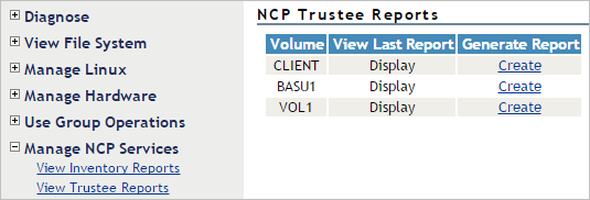 In the left navigation panel, select Manage NCP Services > View Trustee Reports.