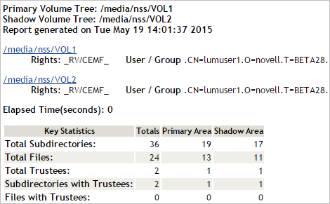In Novell Remote Manager, the new View Trustee Reports option allows you to generate a trustee report for a specified NSS volume. This includes Dynamic Storage Technology shadow volumes that are comprised of two NSS volumes. You can display the last trustee report in the Web browser, or send the report to the e-mail addresses that you have preconfigured for Novell Remote Manager. A trustee report shows the rights settings by folder for each user or group that is a trustee on the NSS volume.