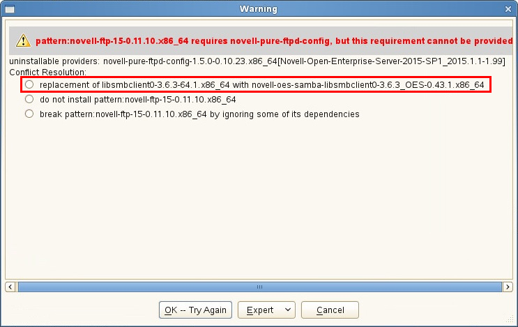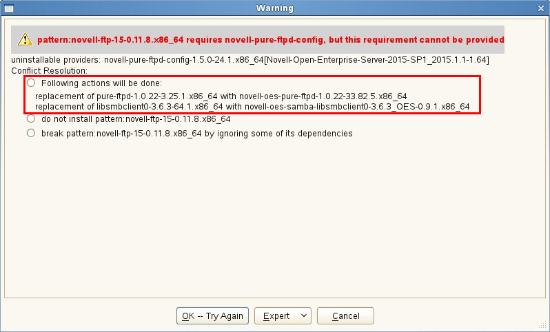 If you select Patterns > OES Services > Novell FTP during the Add-On installation, a package conflict warning message is displayed.