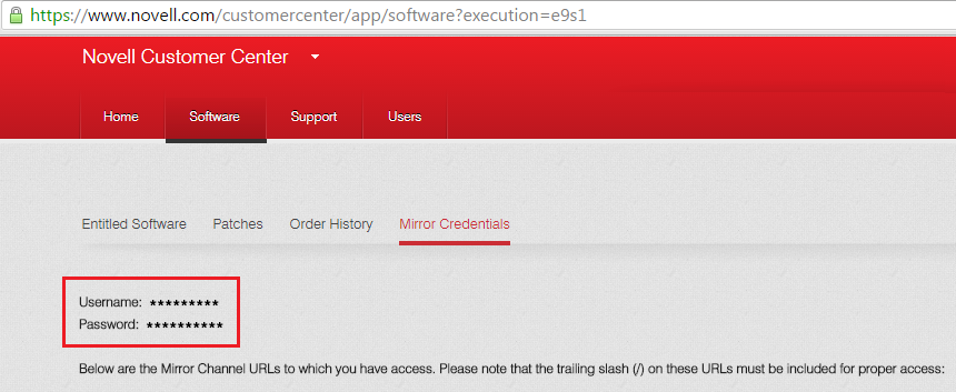 The username and password must be Mirror Credentials available in Novell Customer Center as follows: