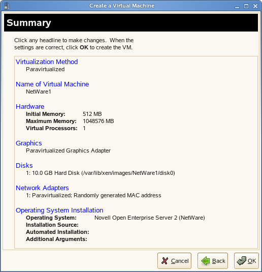 When you have the virtual machine settings the way you want them, click OK to proceed with the creation of the virtual machine and the installation of the virtual NetWare server.