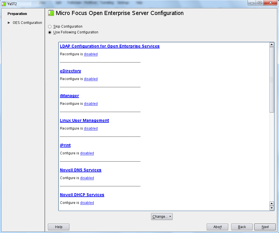 IMPORTANT:You cannot uninstall an OES service by deselecting it. For more information about removing service functionality from the server, see Section 14.0, Disabling OES 2015 Services.