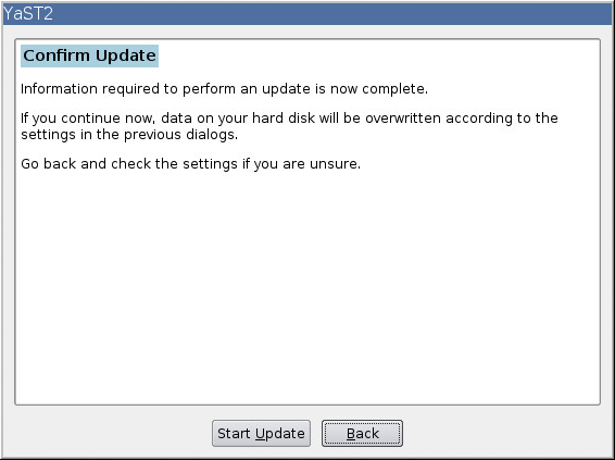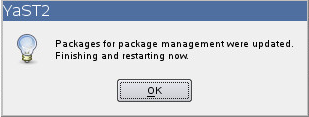 If the update makes changes to YaST, the following message displays. If so, click OK to restart YaST.