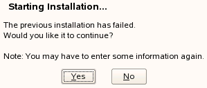 If the installation was interrupted, the following message might display. If so, click Yes to continue with the installation, then enter the root password.