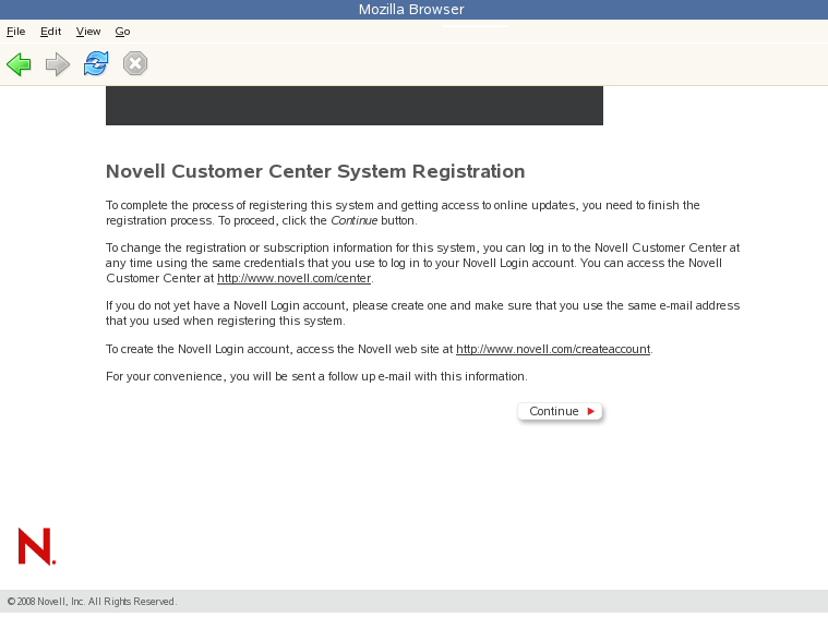 After you click Continue, the following message is displayed with the Manual Interaction Required page. Wait until this message disappears and the Novell Customer Center Configuration page displays with the message: Your configuration was successful.