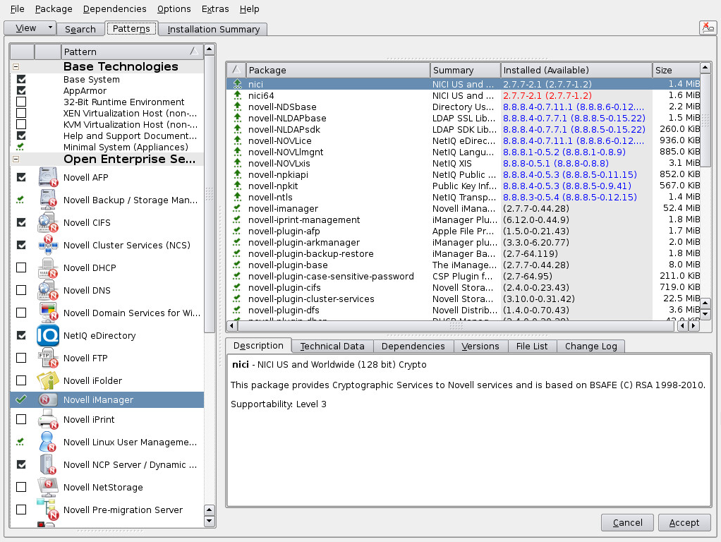 IMPORTANT:If you deselect a pattern after selecting it, you are instructing the installation program to not install that pattern and all of its dependent patterns. Rather than deselecting a pattern, click Cancel to cancel your software selections, then click the Select Patterns heading again to choose your selections again.