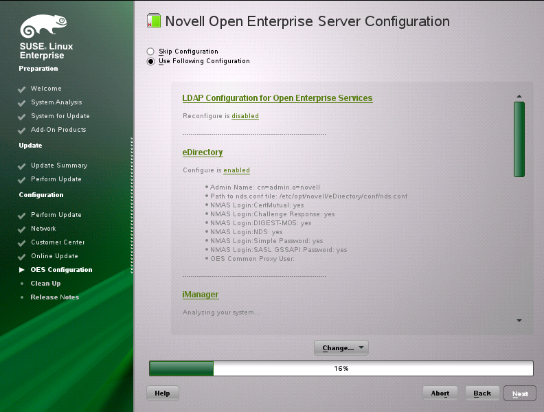 If you change the status to Configuration is disabled, you must configure the OES components after the installation is complete. See Installing or Configuring OES 2015 SP1 on an Existing Server.