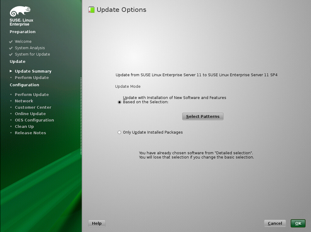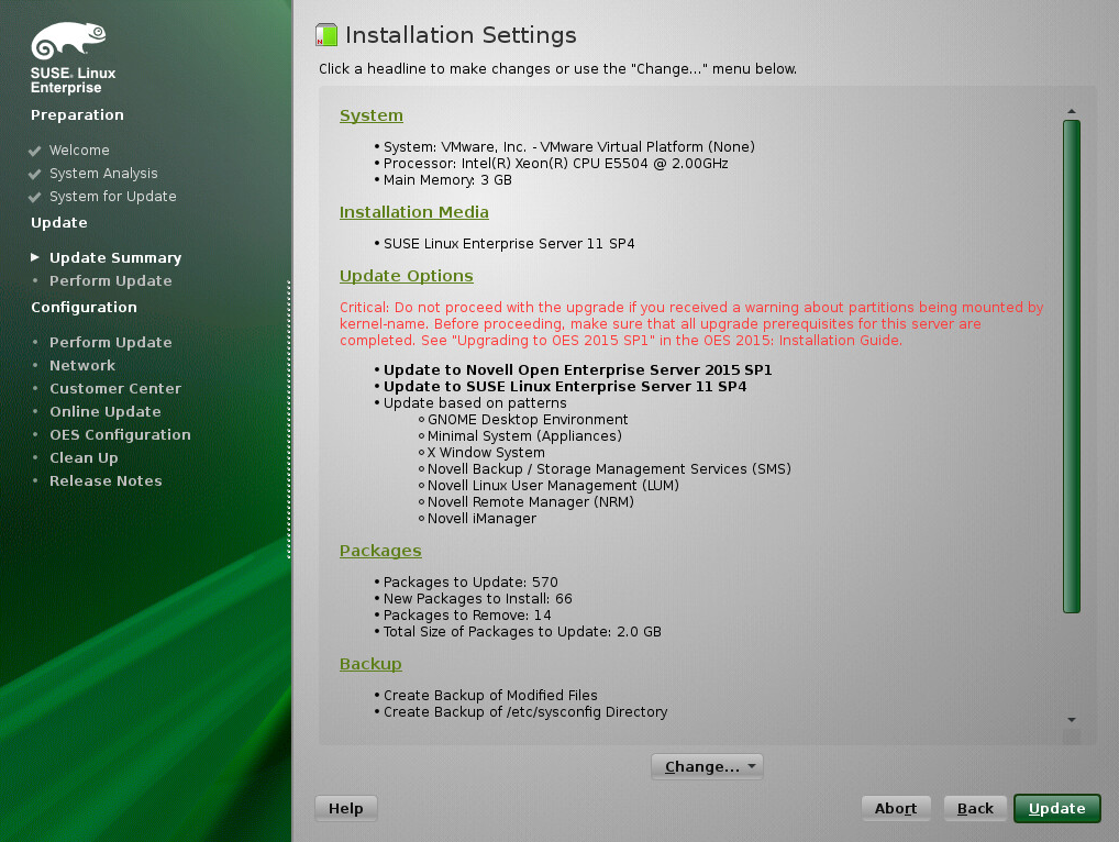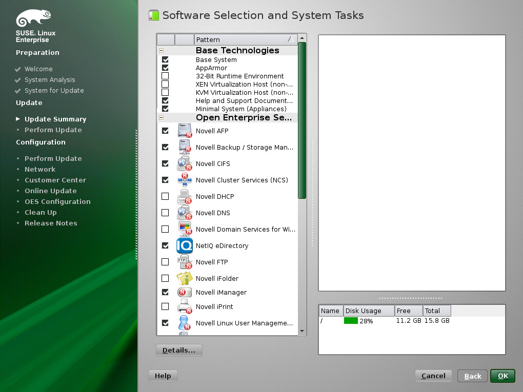 IMPORTANT:To verify that previously installed services are selected for installation and to install any additional OES services during the upgrade, you must customize the Update Options on the Installation Settings page.