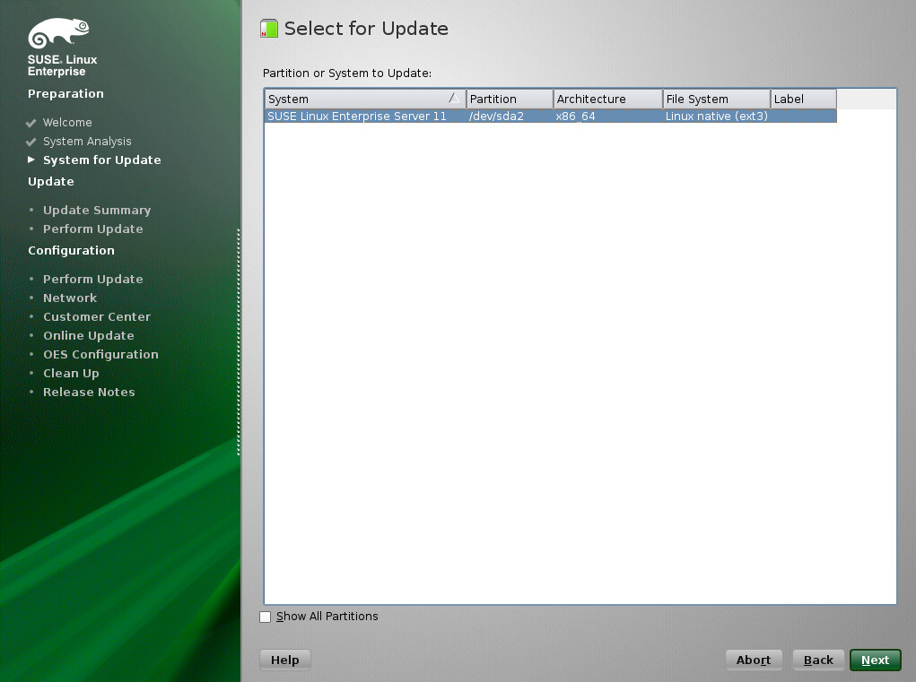 YaST tries to determine the correct root (/) partition. If there are several possibilities, or if YaST can’t definitely determine the correct root partition, the Select for Update page displays.
