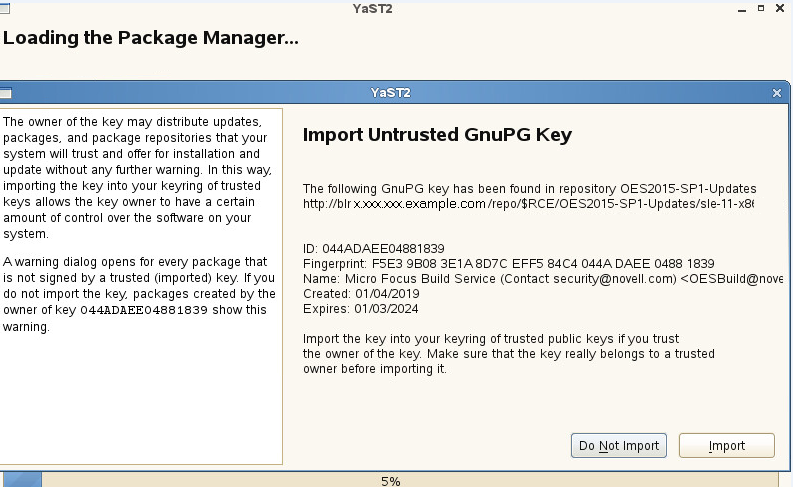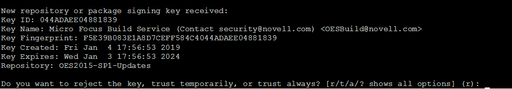 Beginning with January 2019, the OES update repository and OES packages are signed with 4096 bit key. The oes-build-key patch adds the 4096-bit key to the rpm keyring of the OES server. When this patch is applied, it displays a message to import the new keys to the keyring in the following scenarios: