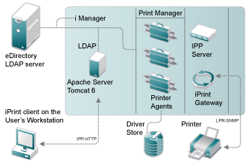 iPrint consists of three main components: the Print Manager, the Driver Store, and the iPrint Client. Other supporting components include the Apache Web Server, iManager, and eDirectory.