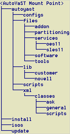 Figure 6-1 illustrates the Novell Consulting Installation Framework stored in the directory structure underneath .../autoyast.