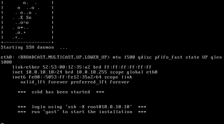 When the system is fully initialized, a message with instructions on how to log in to the server and how to invoke the installation appears on the screen.