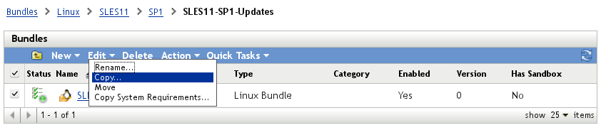 Although there isn’t a specific menu within ZENworks Configuration Management to fulfill these requirements, they can be achieved easily within ZENworks Configuration Management by copying an existing update bundle and assigning properties to the copied bundle. The copy process does not increase disk space use because it only uses some internal pointers that are set within the database.