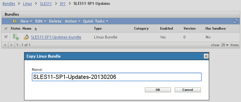 To freeze this bundle, you need to execute the actions illustrated in the following figures. The SLES11-SP1-Updates bundle created and maintained by the mirror process is used as the source for a new frozen patch level.