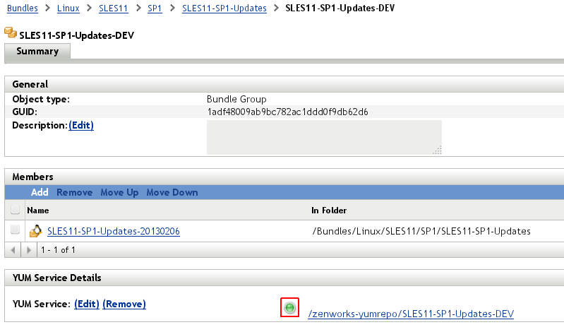 If a new patch cycle occurs, the frozen patch bundle representing the new patch level must be added to the bundle group assigned to the target devices. At the same time, the bundle representing the old frozen patch level must be removed from this same bundle group. This changes the status of the YUM service from green to yellow, indicating that the YUM service is not updated with the latest content on one or more servers. The update happens automatically at the time configured in your YUM Service Settings (see Section 10.4, Configuring the Inventory Schedule).
