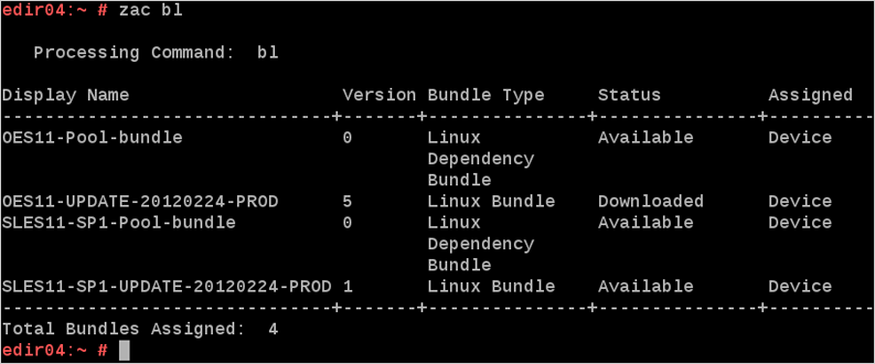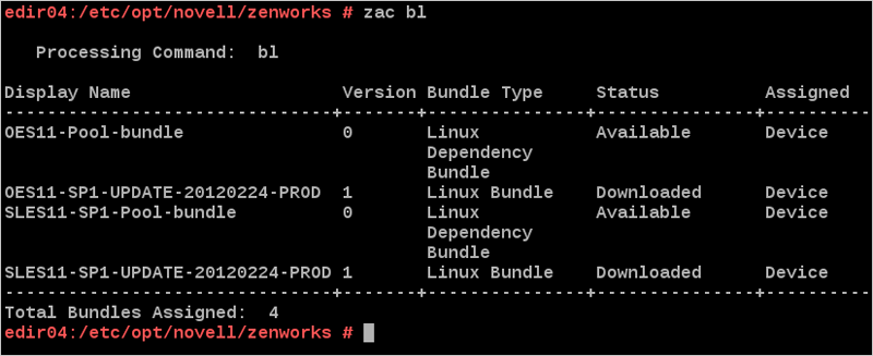 For this reason, Novell Consulting strongly recommends using zac bin as shown in the following figure. The commands displayed there have been executed after zac up to obtain the correct state of the bundle view.