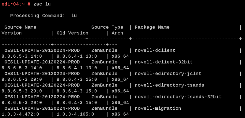 You can use the zac list-updates (zac lu) command to verify if there are still patches that have not yet been applied to the device. In the following example, there are still uninstalled patches because the previous patch update did not include the OES 11 patches: