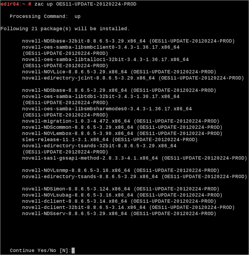 You can also use zac up for installing patches from a frozen bundle. The example in this section uses the frozen OES 11 update bundle.