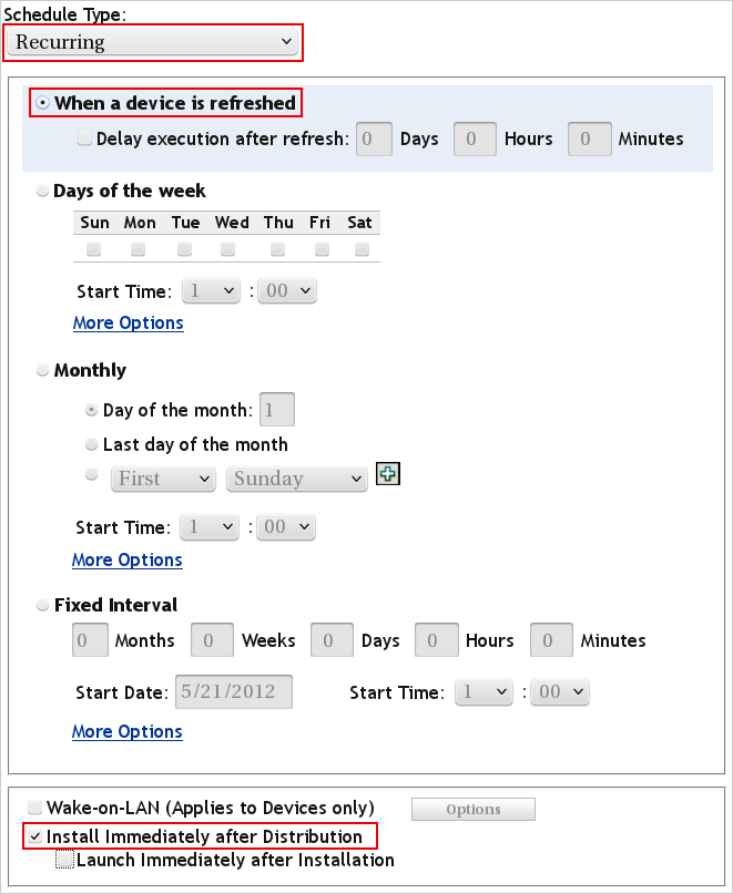 With a Distribution Schedule, you can pre-distribute software bundles to remote devices. For example, assume that you have a large amount of data that must be transported via a slow WAN link. In this case, the Distribution Schedule ensures that the data is delivered to remote devices within the desired time, such as one week. It can then be installed manually or automatically.