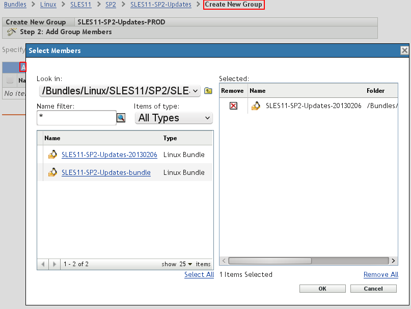Figure 12-10 Creating a Bundle Group Needed by SLES 11 SP 2 Devices - Select Members