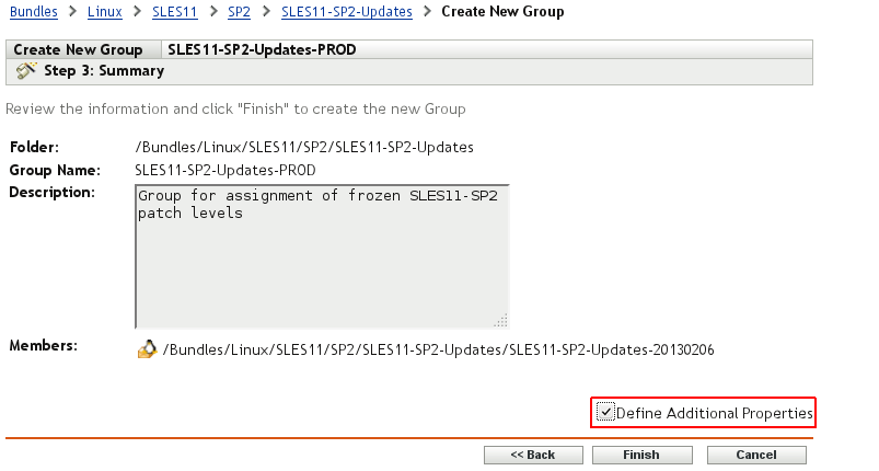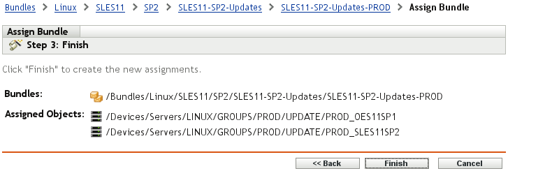 The bundle group assigning the SLES 11 SP2 frozen patch level to all SLES 11 SP2 devices and OES 11 SP1 devices in production has been created successfully.