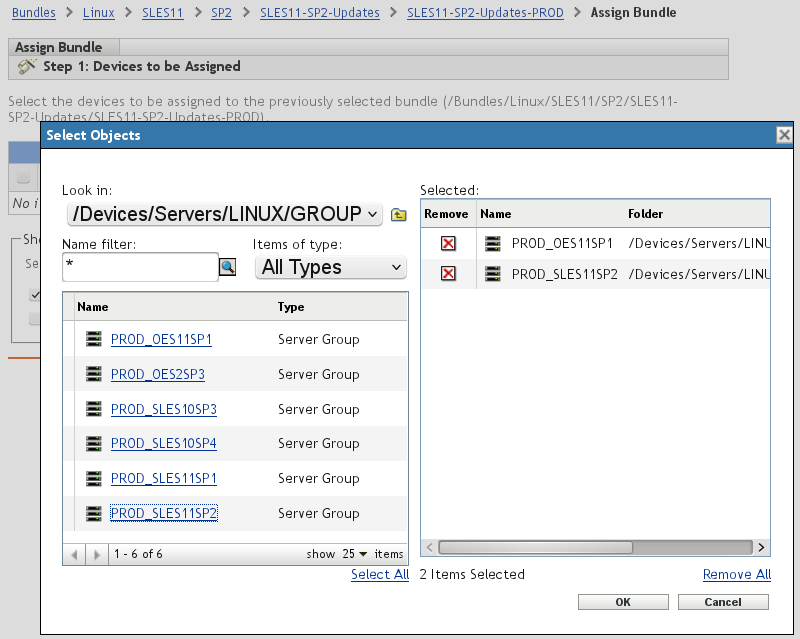 Click Add on the bundle group summary page to select the desired device groups. For this example, the PROD_OES11SP1 and the PROD_SLES11SP2 device groups have been selected.