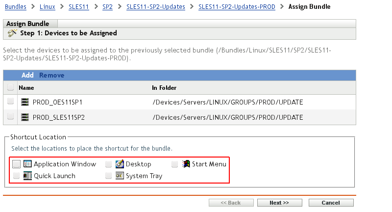 Figure 12-14 Device Group Assignment To a Bundle Group - Shortcut Locations Deselected