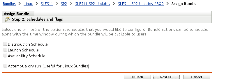 The next page is important when the distribution or installation of bundles must be scheduled. Three different scheduling types are available. Only the Distribution Schedule and the Availability Schedule are of interest for Linux devices.