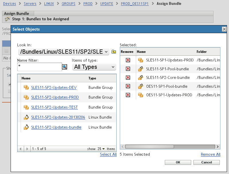 The assignment process now needs to be replicated for the SLES 11 SP1 updates as well as for the OES 11 SP1 updates. In addition, the core and pool bundles also need to be assigned to the same device croups as the SLES11-SP2-Updates-PROD bundle group.