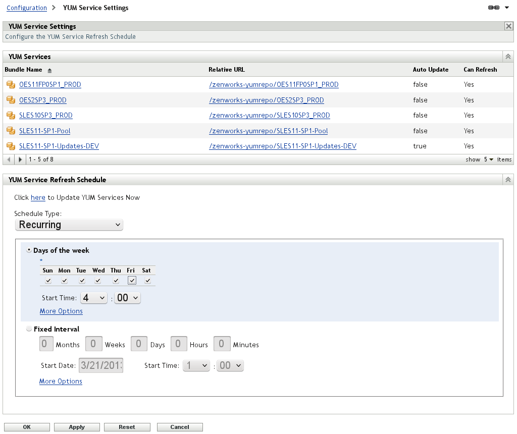 By default, the ZCM server updates the YUM service on the target devices every Saturday at 01:00. You can change this in the Infrastructure Management section of the Configuration page.