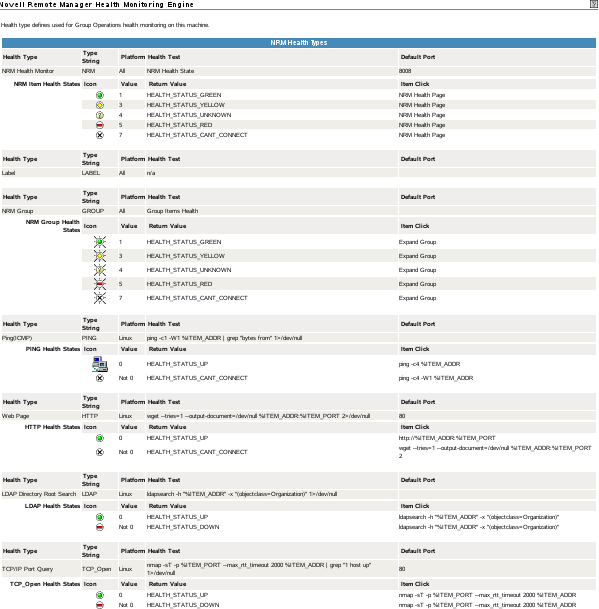 Clicking the NRM Health Types link in the navigation frame displays the Novell Remote Manager Health Monitoring Engine - NRM Health Types content. This page gives you an overview of the Group Monitoring types that are defined on the current host. The legend shows the statuses you might see when you are monitoring groups of hosts with various monitored items and is a graphical view of the items defined in the /opt/novell/nrm/NRMGroupHealthInfo file.