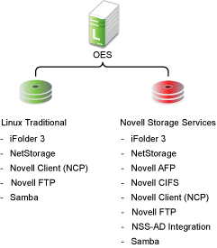 The NCP Server included in OES features emulation of the Novell Trustee Model and inheritance plus visibility when it runs on traditional POSIX file systems such as Ext3, Reiser, and XFS. When it runs on NSS, these capabilities are synchronized with the NSS File system and its extended directory and file attributes, such as Rename Inhibit.