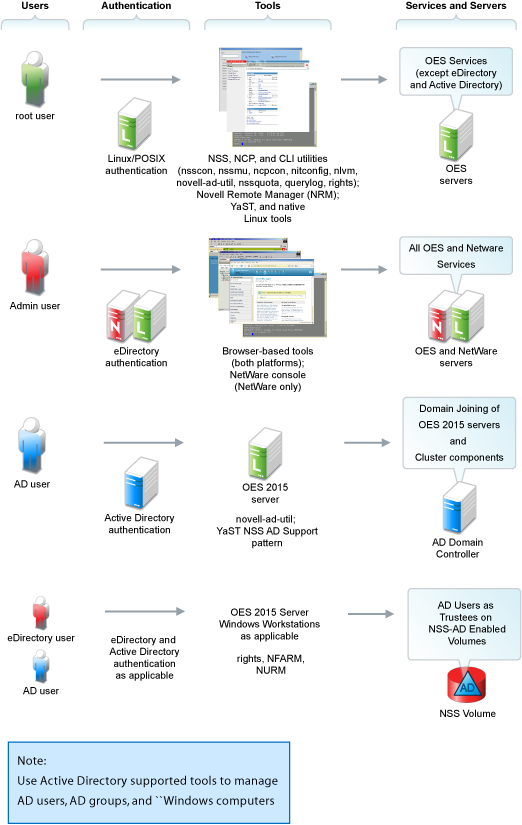 As shown in Figure 11-1, Open Enterprise Server provides a rich set of service-management and server-management tools, including browser-based and server-based interfaces that help you implement and maintain your network. Access to most of these management interfaces is controlled through eDirectory. However, a few interfaces, such as YaST on SUSE Linux Enterprise Server 11 servers, require local authentication.